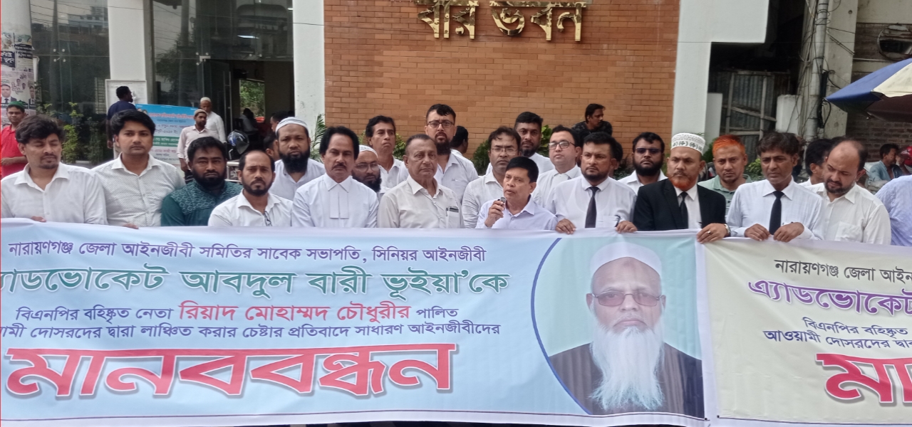 নারায়ণগঞ্জ বারের সিনিয়র আইনজীবি এড. আব্দুল বারী ভূইয়াকে লাঞ্চিত কারার প্রতিবাদে মানববন্ধন করেছেন আইনজীবীরা।