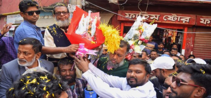 আবুল কালামের ধানের শীষের প্রচারণায় জামাল হোসেনের ফুলের শুভেচ্ছা ও গণসংযোগ