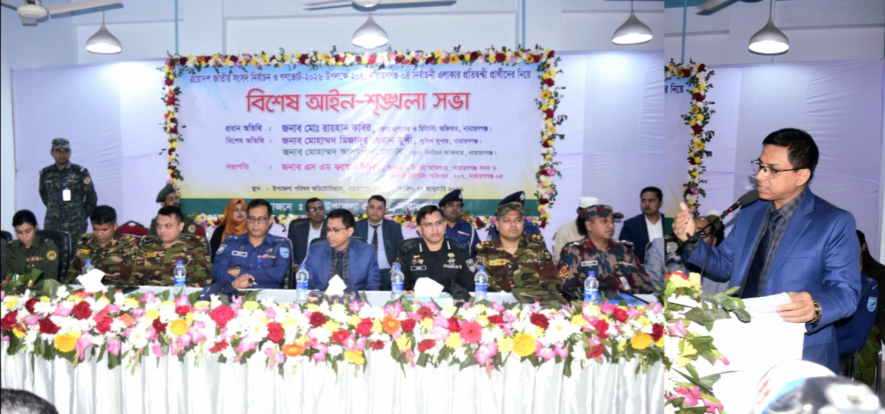 আইনশৃঙ্খলা বিষয়ক সভায় বক্তব্য রাখেন নারায়ণগঞ্জ জেলা প্রশাসক ও রিটানিং অফিসার মোহাম্মদ রায়হান কবির, পুলিশ সুপার মোহাম্মদ মিজানুর রহমান মুন্সী, জেলা নির্বাচন অফিসার আলমগীর হোসেন, বিজিপি কর্ণেল মির্জা আরাফাত, র‍্যাব-১১ এর অধিনায়ক সাজ্জাদ, সেনাবাহিনীর ল্যাফটেন্ট কর্ণেল আরমিন,নারায়ণগঞ্জ জেলা আনসার ও ভিডিপি কমান্ড্যান্ট কানিজ ফারজানা শান্তা, প্রমূখ। এসময় প্রশাসনিক, রাজনৈতিক দলের নেতৃবৃন্দরা উপস্থিত ছিলেন।