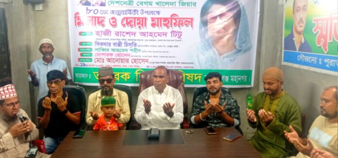 বিএনপি চেয়ারপার্সন বেগম খালেদা জিয়ার ৮০তম জন্মদিন উপলক্ষে নারায়ণগঞ্জ মহানগর তারেক জিয়া পরিষদের উদ্যোগে আলোচনা সভা ও দোয়া মাহফিল অনুষ্ঠিত হয়েছে ।