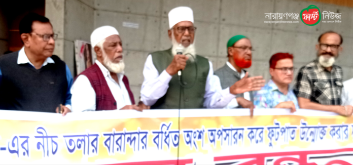 বঙ্গবন্ধু সড়কস্থিত আলী আহাম্মদ চুনকা নগর পাঠাগার ও মিলনায়তনের নীচতলার বারান্দার অবৈধ বর্ধিত অংশটি অপসারণ করতঃ ফুটপাথটি ছাত্র-ছাত্রী ও পথচারীদের চলাচলে উন্মুক্ত করা এবং নারায়ণগঞ্জের সার্বিক যানজট নিরসণের দাবীত শনিবার (১৮ জানুয়ারী) সকাল ১১টায় চুনকা পাঠাগার চত্বরে “আমরা নারায়ণগঞ্জবাসী” সংগঠনের উদ্যোগে সংগঠনের সভাপতি বীর মুক্তিযোদ্ধা আলহাজ্ব নূর উদ্দিন আহমদ এর সভাপতিত্বে ও সহ-সাংগঠনিক সম্পাদক মাকিদ মাস্তাকিম শিপলু’র সঞ্চালনায় এক মানবন্ধন কর্মসূচী পালিত হয়।