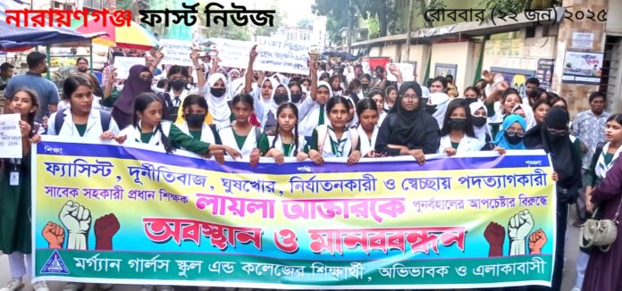 নারায়ণগঞ্জ শহরের ঐতিহ্যবাহী শিক্ষা প্রতিষ্ঠান মর্গ্যান গার্লস স্কুল অ্যান্ড কলেজ–এর ছয় শিক্ষকের বিরুদ্ধে মিথ্যা মামলা প্রত্যাহার এবং শিক্ষা প্রতিষ্ঠানে শিক্ষার সুষ্ঠু পরিবেশ ফিরিয়ে আনার দাবিতে মানববন্ধন করেছে শিক্ষার্থী, অভিভাবক, শিক্ষক ও এলাকাবাসী।