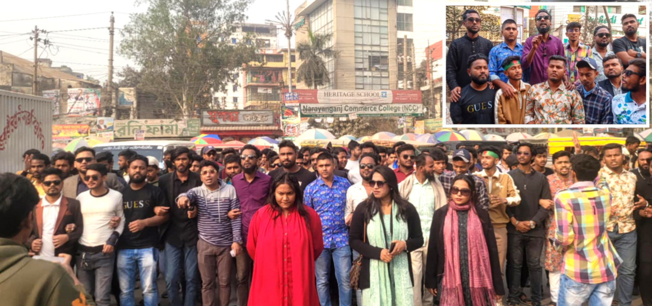 নারায়ণগঞ্জের সরকারি তোলারাম কলেজ ও সরকারি মহিলা কলেজ এবং গুরুত্বপূর্ণ কয়েকটি স্থান ও সরকারি দপ্তরের সামনে শামীম ও তার ছেলে অয়ন ওসমানের নামে ছাত্রলীগের পোস্টারিং এর প্রতিবাদে জড়িতদের গ্রেফতারে শহরে বিক্ষোভ মিছিল ও সমাবেশ করেছে জেলা ও মহানগর ছাত্রদলের সাবেক নেতারা। রবিবার (২৬ জানুয়ারি) দুপুরে ছাত্রদলের নেতা কর্মীরা কদম রসুল কলেজ ছাত্রদলের সাবেক সাধারণ সম্পাদক আতিকুর রহমান রিফাতের নেতৃত্বে নারায়ণগঞ্জ চাষাঢ়া রেলষ্টেশন থেকে বিক্ষোভ মিছিলটি বেড়িয়ে শহর প্রদক্ষীণ করে। শেষে নারায়ণগঞ্জ প্রেসক্লাবের সামানে সংক্ষিপ্ত সমাবেশ অনুষ্ঠিত হয়। পোস্টার সাঁটানোর সাথে জড়িতদের গ্রেফতারের চব্বিশ ঘন্টার আল্টিমেটাম দিয়ে কদম রসুল কলেজ ছাত্রদলের সাবেক সাধারণ সম্পাদক আতিকুর রহমান রিফাত বলেন, ডিসি,এসপি কে বলতে চাই আপনারা দুষ্কৃতিকারীকে শনাক্ত করতে পারেননি। আমরা তা করেছি তিনি ছাত্রলীগ নেতা অনিক। এ ছাড়া এদের সাথে যারা জড়িতদের এই অনিককে গ্রেফতার করে তার মাধ্যমে শনাক্ত করে ২৪ ঘন্টার মধ্যে গ্রেফতার না করলে আপনাদের অফিস ঘেরাও করা হবে বলে হুঁশিয়ারী দেন ছাত্রদল নেতা রিফাত। এ সময় জেলা ছাত্রদলের সাবেক সাংগঠনিক সম্পাদক মেহেদী হাসান দোলন বলেন,আমরা ছাত্রলীগের কুকর্ম দেখেছি তারা চাঁদাবাজি,সন্ত্রাস সব কিছুর সাথে জড়িত ছিলো। অয়ন ওসমানের কিছু অনুসারী তাকে খুশি করতে এবং পলাতক বোরকা শামীমের ছবি দিয়ে পোস্টার লাগিয়েছে। আমরা এর প্রতিবাদ জানাই এবং তাদের চব্বিশ ঘন্টার মধ্যে গ্রেফতার না করলে আমরা আপনাদের অফিস ঘেরাও করবো। বন্দর উপজেলা ছাত্রদলের সাবেক সভাপতি সাকিব মোহাম্মদ রাইয়ান বলেন,ছাত্রলীগের জন্য এই শহরে ঠিকমতো বসবাস করতে পারিনি,তাদের সন্ত্রাসী কার্যক্রমের জন্য ছাত্ররা ঠিক মতো লেখা পড়া করতে পারেনি। হুশিয়ারি দিয়ে বলেন,যারা পোস্টার লাগান যদি আমরা দেখতে পাই হাত-পা ভেঙে এই শহর থেকে বিতাড়িত করবো। তিনি প্রশ্ন রেখে বলেন,  এই ছাত্রলীগ তারা মায়ের বুক খালি করেছে, তাদের জন্য শিক্ষার্থীরা হলে থাকতে পারেনি।এই সংগঠন কিভাবে পোষ্টার লাগায়?তাদের কারা নারায়ণগঞ্জে শেল্টার দিচ্ছে এইসব চিন্হিত করুন। আরও বক্তব্য রাখেন, জেলা ছাত্র দলের সাবেক সহ-সভাপতি ইয়াসিন আরাফাত, ফতুল্লা থানা ছাত্রদলের সাবেক সদস্য সচিব রিয়াদ দেওয়ান, জেলা ছাত্রদলের সাবেক দপ্তর সম্পাদক শাকিল আহম্মেদ, এনায়েত নগর ইউনিয়ন ছাত্রদলের সাবেক সভাপতি জুম্মন আহমেদ ইমন। বিক্ষোভ ও সমাবেশে আরো উপস্থিত ছিলেন, বন্দর থানা ছাত্রদলের সাবেক সাংগঠনিক সম্পাদক আকাশ বাছির, কদম রসুল ছাত্রদলের নেত্রী কাজী কর্ণিয়া, আহমেদ শ্রাবন্তী,মাশরাফি আলম,মো:রাহাত, হামিম আহমেদ,মুক্তার হোসেনসহ জেলা ও মহানগর ছাত্