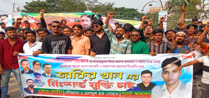 নারায়ণগঞ্জ জেলা ছাত্রদলের সাবেক সভাপতি ও মহানগর বিএনপি নেতা জাকির খানের মুক্তির দাবি জানিয়েছেন যুবদল নেতা সনেট আহমেদ ও এনামুল হক সোহানের নেতৃত্বে নেতাকর্মীরা।