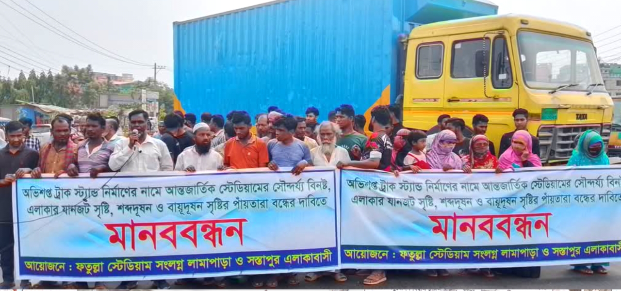 নারায়ণগঞ্জে অভিশপ্ত ট্রাক স্ট্যান্ড নির্মাণের নামে আন্তজার্তিক স্টেডিয়ামের সৌন্দর্য্য বিনষ্ট, এলাকার যানজট সৃষ্টি, শব্দদূষন ও বায়ুদূষন সৃষ্টির পাঁয়তারা বন্ধের দাবিতে মানববন্ধন করেছে ফতুল্লা স্টেডিয়াম সংলগ্ন শিবু মার্কেট লামাপাড়া ও সস্তাপুর এলাকাবাসী। ১৬ এপ্রিল মঙ্গলবার বেলা ১২টায় ঢাকা-নারায়ণগঞ্জ লিংক রোডের লামাপাড়ায় এ মানববন্ধন কর্মসূচি পালিত হয়। মানববন্ধনে বক্তারা বলেন,আমাদের জীবনের উপর করাত চালিয়ে ট্রাকস্ট্যান্ড নির্মাণ করতে দেয়া হবে না। এখানে আন্তর্জাতিক স্টেডিয়াম,পরিবেশ অধিদপ্তরের কার্যালয় রয়েছে,মাদকদ্রব্য নিয়ন্ত্রণ অধিদপ্তর রয়েছে  অথচ এইখামে অভিশপ্ত ট্রাকস্ট্যান্ড নির্মাণ করা হচ্ছে কার ইশারায় কার শেল্টারে। তারা আরো বলেন,কোন আবাসিক এলাকায় কিংবা স্টেডিয়ামের সামনে ট্রাকস্ট্যান্ড করা সম্পূর্ণরূপে অযৌক্তিক। লামাপাড়া ও সস্তাপুর এলাকাবাসীর সুস্থ জীবন যাপনের স্বার্থে ট্রাকস্ট্যান্ডটি না করতে দেয়ার জন্য মাননীয় জেলা প্রশাসনসহ মাননীয় প্রধান উপদেষ্টার হস্তক্ষেপ কামনা করছি। মানববন্ধনে সস্তাপুর ও লামাপাড়া এলাকার শত শত নারী-পুরুষ অংশগ্রহণ করেন। মানববন্ধন চলাকালে  ঢাকা-নারায়ণগঞ্জ লিংকরোডে  প্রায় ১ ঘন্টা যান চলাচল বন্ধ ছিল।