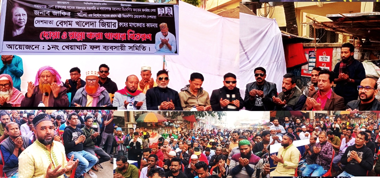 তিন তিন বারের সাবেক প্রধানমন্ত্রী ও বাংলাদেশ জাতীয়তাবাদী দল, বিএনপি এর চেয়ারপারসন বেগম খালেদা জিয়ার রুহের মাগফেরাত কামনায় জাকির খানের নির্দেশনা ১নং খেয়াঘাট ফল ব্যবসায়ী সমিতির মিলাদ ও দোয়া অনুষ্ঠিত।
