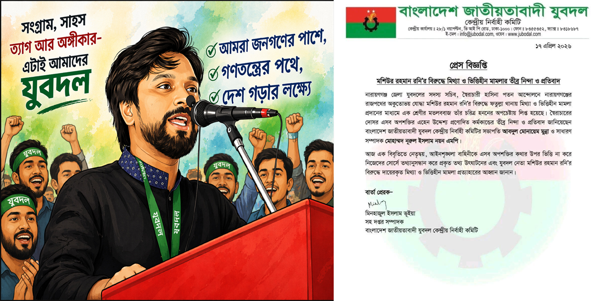 মঙ্গলবার (১৭ এপ্রিল ২০২৬) পাঠানো এক প্রেস বিজ্ঞপ্তিতে যুবদল নেতারা অভিযোগ করেন, রনিকে রাজনৈতিকভাবে নিষ্ক্রিয় করতে একটি ‘সুনির্দিষ্ট মহল’ ধারাবাহিকভাবে মিথ্যা ও ভিত্তিহীন মামলা দিয়ে তাকে ঘিরে ফেলছে। তাদের দাবি, এসব মামলা কেবল আইনি প্রক্রিয়া নয়—বরং বিরোধী কণ্ঠকে স্তব্ধ করার একটি কৌশল।