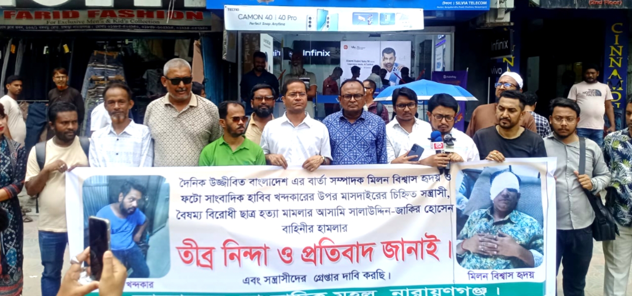 নারায়ণগঞ্জে দৈনিক উজ্জীবিত বাংলাদেশ-এর বার্তা সম্পাদক মিলন বিশ্বাস হৃদয় ও ফটো সাংবাদিক হাবিব খন্দকারের ওপর সন্ত্রাসী হামলার প্রতিবাদে নারায়ণগঞ্জ প্রেসক্লাবের সামনে মানববন্ধন অনুষ্ঠিত হয়।