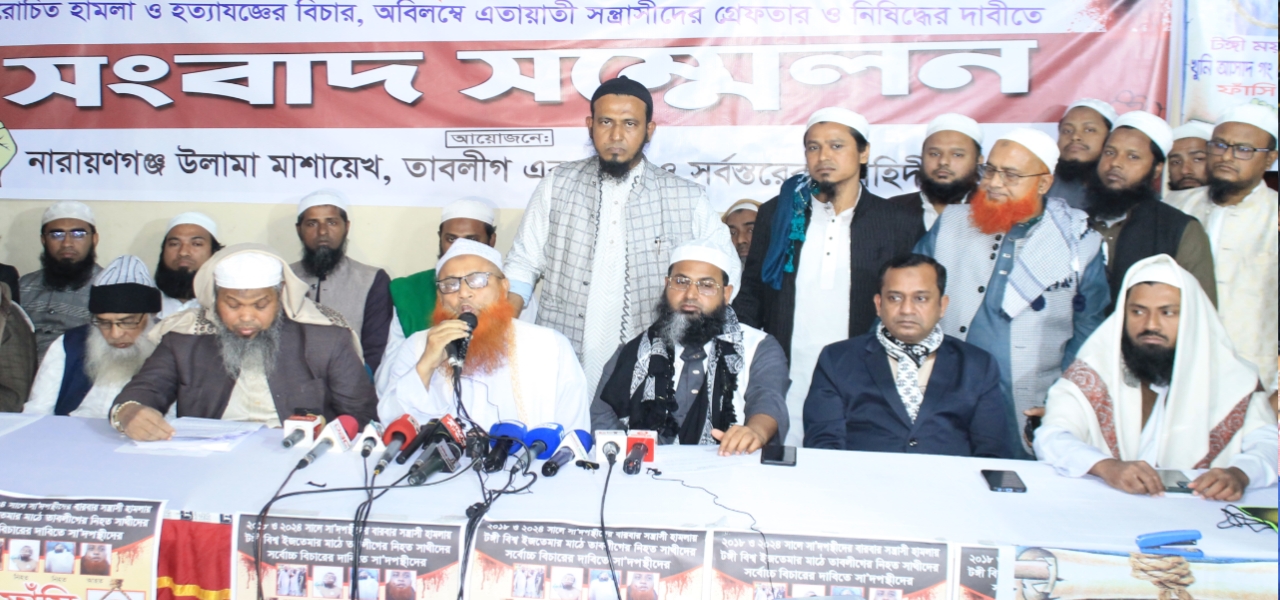 এসময় তারা সংবাদ সম্মেলনে দাবি করেন গত ১৮-১২-২০২৪ইং ঘটে যাওয়া সাদপন্থী সন্ত্রাসবাদীদের সন্ত্রাসী কর্মকাণ্ডে ইতোমধ্যে আমাদের চারজন ভাই শাহাদাত বরণ করেছেন। অসংখ্য সাথী গুরুতর আহত অবস্থায় হাসপাতালে আছে।তাদের অনেকের অবস্থা এখনো আশংকাজনক। তাই আমাদের দাবি হচ্ছে রাতের আঁধারে তাবলীগের ঘুমন্ত নিরীহ মুখলেস সাথীদের উপর অতর্কিত হামলাকারী সাদপন্থী সন্ত্রাসীদের অবিলম্বে গ্রেফতার ও ফাঁসির ব্যবস্থা করতে হবে। নারায়ণগঞ্জ জেলার সকল মসজিদে তাদের কার্যক্রম নিষিদ্ধ করতে হবে। নারায়ণগঞ্জ শহর থেকে কালিবাজার, আড়াইহাজার ও রূপগঞ্জ মারকায নামে সাদপন্থীদের সন্ত্রাসী কার্যক্রম পরিচালনার আখড়া স্থায়ীভাবে বন্ধ ঘোষণা করতে হবে। নারায়ণগঞ্জ জেলা থেকে যেসব সন্ত্রাসী টঙ্গীর নৃশংস হত্যাকান্ডে অংশগ্রহণ করেছে, তাদের বিরুদ্ধে এবং যারা তাদের মদদ জুগিয়েছে তথা শাহীন ইবরাহীম, মনির টাওয়ারের মনির, আসাদ, আবু তাহের, ইঞ্জি. মিঠু, আবিদ, সোহেল, জালালুদ্দীন রাসেল, আক্তার, মোফাজ্জল, আজিজুল হক এর বিরুদ্ধে আইনী ব্যবস্থা নিয়ে অনতিবিলম্বে তাদেরকে গ্রেফতার করতে হবে, সন্ত্রাসীদের গডফাদার ইঞ্জিনিয়ার ওয়াসিফ, তার ছেলে উসামা, মুআয বিন নূর, জিয়া বিন কাসেম, আব্দুল্লাহ মনসুর, রেজা আরিফসহ সকল সন্ত্রাসী গডফাদারকে দ্রুত গ্রেফতার ও ফাঁসির আওতায় আনতে হবে। এবং কাকরাইল মসজিদে প্রবেশ ও তুরাগ নদীর তীরে বিশ্ব ইজতেমার মাঠে তাদের কার্যক্রম স্থায়ীভাবে নিষিদ্ধ হওয়ার বিষয়টি নিশ্চিত করতে হবে।