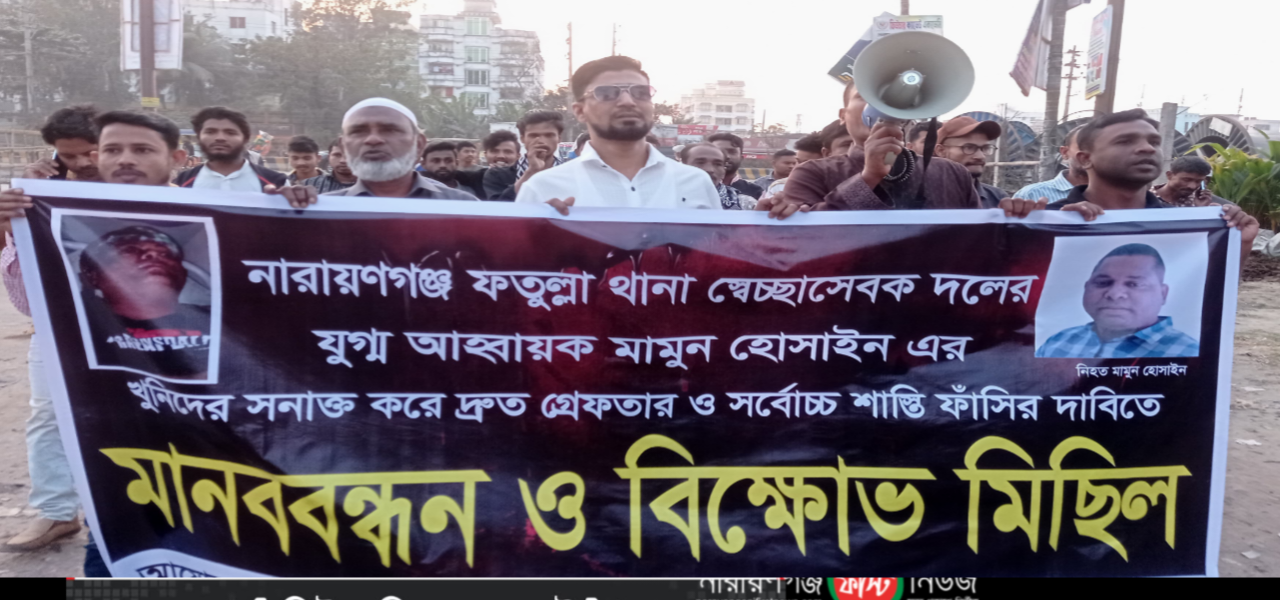 নারায়ণগঞ্জ ফতুল্লা থানা স্বেচ্ছাসেবক দলের যুগ্ম আহ্বায়ক মামুন হোসাইন এর খুনিদের সনাক্ত করে দ্রুত গ্রেফতার ও সর্বোচ্চ শাস্তি ফাঁসির দাবিতে মানববন্ধন ও বিক্ষোভ মিছিল করেন ফতুল্লা ইউনিয়ন ৬ নং ওয়ার্ড বিএনপি ও অঙ্গসংগঠন।