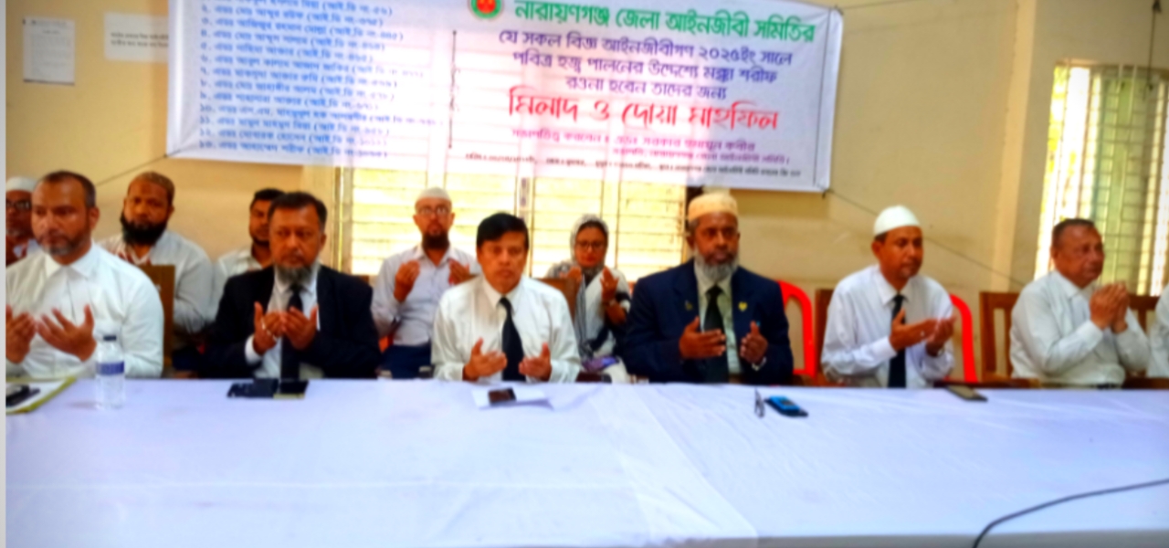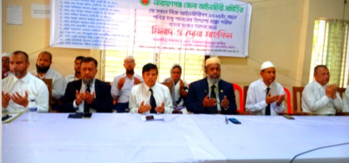 নারায়ণগঞ্জ জেলা আইনজীবী সমিতির পবিত্র হজ্বে গমনকারী সদস্যদের জন্য মিলাদ ও দোয়া মাহফিল অনুষ্ঠিত হয়েছে।